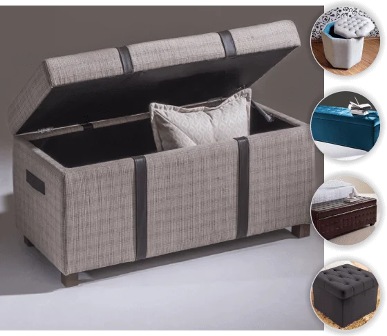 Materiais utilizados na Reforma de puff baú: Tipos de grampos 80/08 - 80/10 - 80/14 - 14/38 - 14/45 - 14/50; Espuma densidade 28 e 33; Cola spray e cola para madeira; Manta acrílica pena 100; Persinta eslástica; Parafusos Sextavado e Philips; Papelão 3mm para proteção da espuma e tecido.